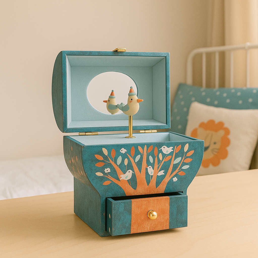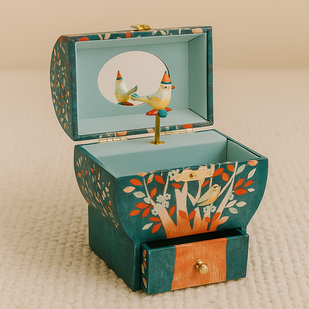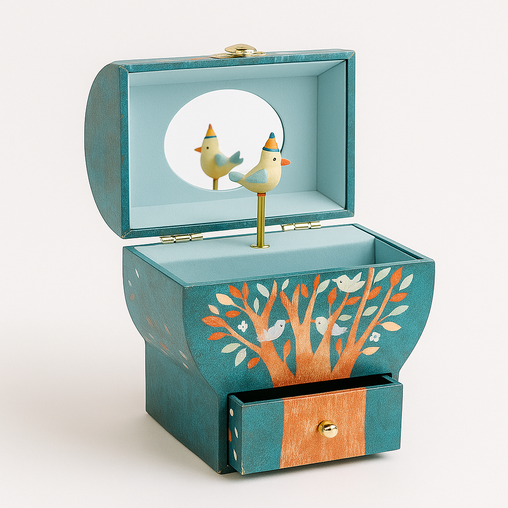 Dieses zauberhafte Musik-Schmuckkästchen begeistert mit seinem liebevollen Waldmotiv, leuchtenden Farben und einer tanzenden Vogel-Figur. Beim Öffnen ertönt eine sanfte Melodie und der kleine Vogel beginnt sich vor dem Spiegel zu drehen – ein bezaubernder Moment für Kinder.